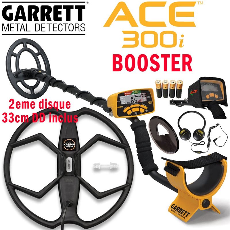 L'ACE 300i est la nouvelle version de l'ACE 250. Il possède toujours 3 modes de détection et 8 niveaux de puissance. Casque, protection pluie, protege-disque inclus. Cette version BOOSTER est livrée avec 2eme disque 33cm DD KARMA bien plus performant qui augmente les performances en profondeur et la surface détectée. Disque vendu seul 159 euros. protège-disque inclus