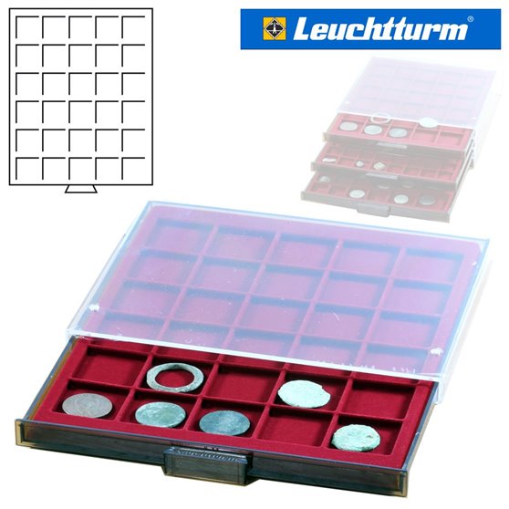 Ce médaillier haut de gamme LEUCHTURM permet de ranger 30 monnaies de diamètres maximum 38mm. Il est idéal pour tous les "gros modules". L'intérieur du tiroir est en feutrine rouge foncé. Vous pouvez empiler plusieurs de nos tiroirs de différents diamètres ou les insérer dans les valises numismatiques vendues séparément.
